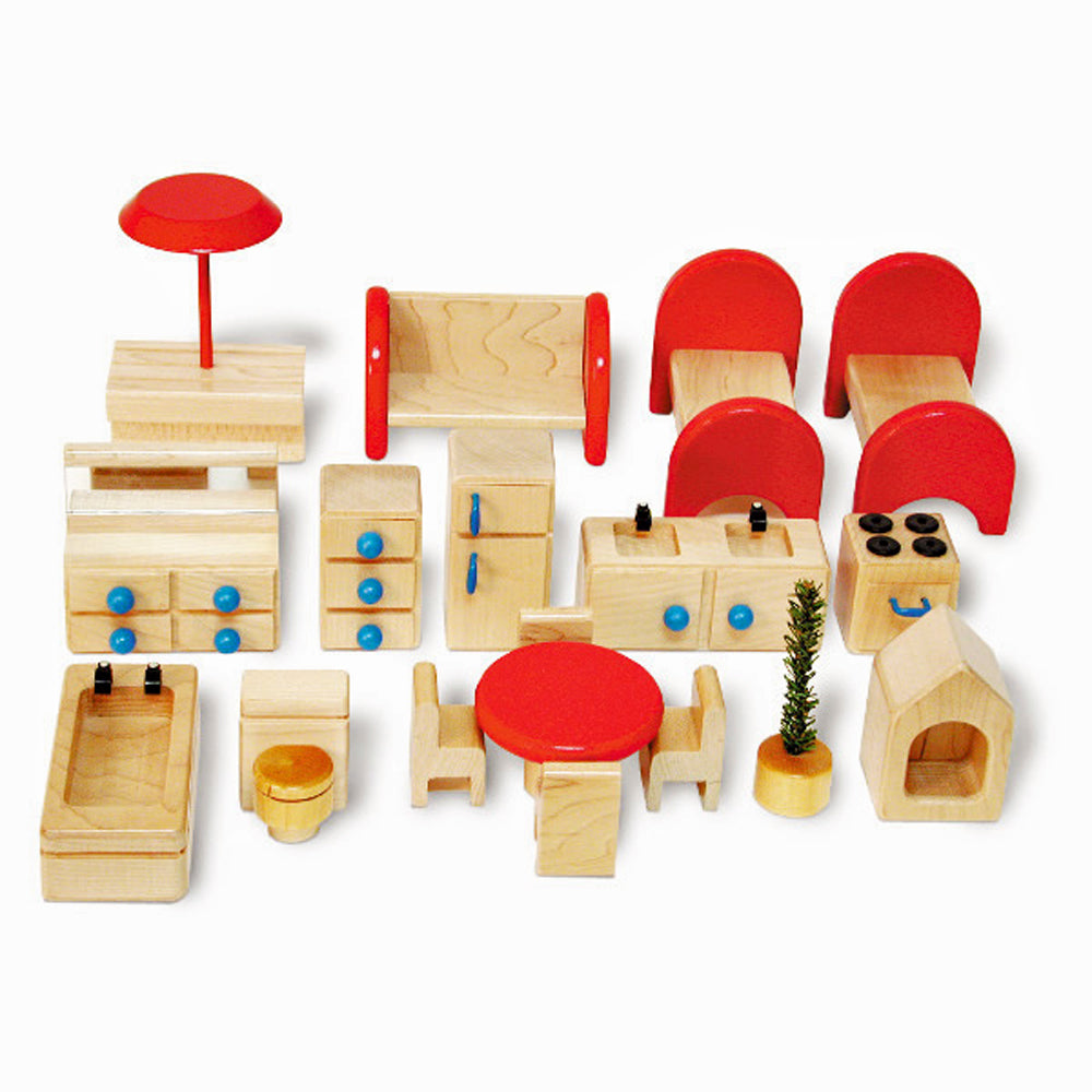 Encourage your children's creativity with this dollhouse furniture set. Set of 18 pieces includes furniture for the kitchen, living room, bedroom, bathroom, and even the dog house! Made in the USA with care.