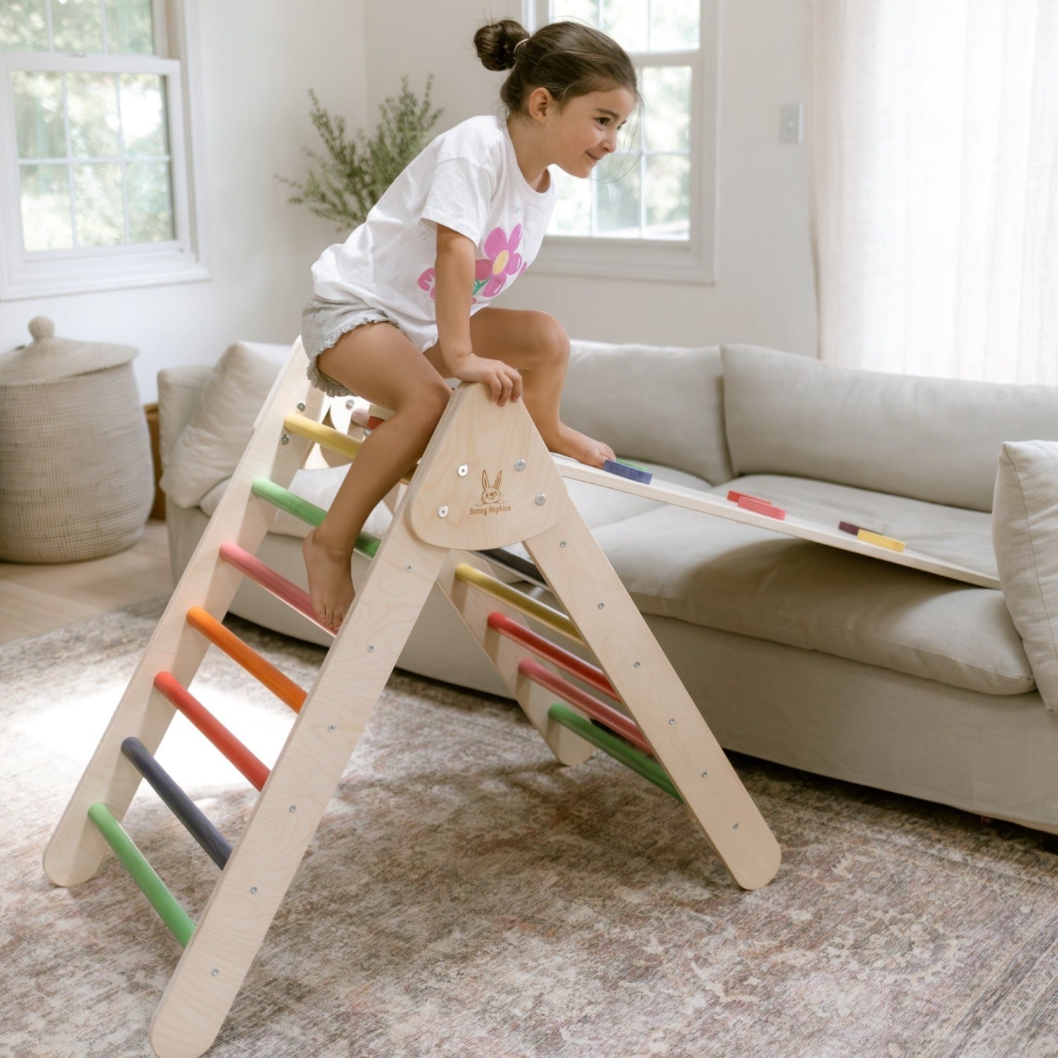 Gift your child the excitement of active, creative play with Bunny Hopkins™ Climbing Triangle! This Pikler Triangle-inspired, heirloom-quality Montessori toy is designed to engage and inspire kids, helping them develop awareness, resilience, perseverance, and teamwork. It is the ideal tool for teaching balance control, motor skills, and other important aspects of growing up. Heirloom quality and expertly crafted from premium American Maple Wood, the Climbing Triangle offers a safe, reliable, and enjoyable playtime for children.