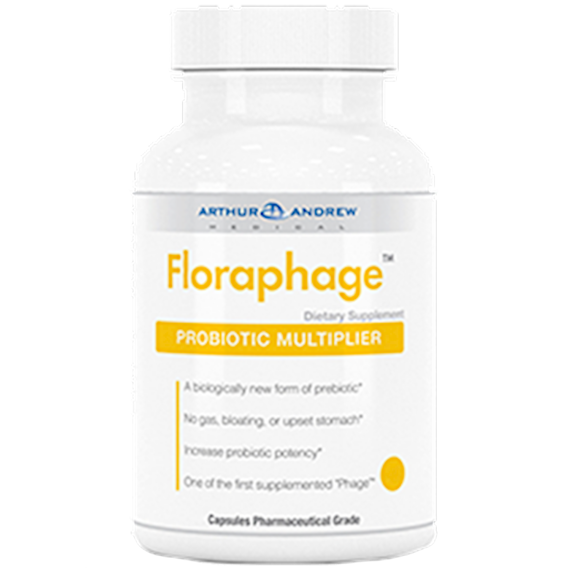 Promotes optimal digestive and immune health by increasing probiotic activity.* Floraphage is a blend of bacteriophage species developed to support the creation of beneficial bacteria throughout the digestive ecosystem. A bacteriophage, or simply phage, is a microscopic protein that reacts with specific bacteria in the gut. The resulting reaction of Floraphage with specific bacteria creates nutrients, known as prebiotics, for beneficial bacteria to consume. Prebiotics uses good bacteria to create an abundance of beneficial bacteria that can help maintain optimal digestive and immune health.* Phages, or bacteriophages, are everywhere. Theyre in our food, in the water we drink, and even on and in our bodies. Phages are the most abundant, naturally occurring organisms on earth and have been safely used for over 90 years in the food supply . Floraphage is the first dietary supplement formula to utilize these amazing microscopic proteins. Floraphage Efficacy Testing and Results: To determine whether Floraphage works, especially when combined with probiotic products, Arthur Andrew Medical conducted several laboratory tests. Floraphage was tested in conjunction with four popular probiotic supplements to determine its ability to increase the potency or growth of each respective product. Each product was grown in a nutrient-rich broth to mimic normal digestive conditions, until each products bacteria reached a specified value using optical density (OD). OD measures the amount of light that is able to scatter through a mixture, which was used to verify that the bacteria for each product had started to grow. Once each product reached an OD of 0.2, indicating that the bacteria were growing and no longer dormant, a one milliliter sampling of each product was grown with Floraphage and one was grown without (the control group). Each of the four tested products showed improvement when grown with Floraphage. The average increase in colony forming unit (CFU) activitywhich is the measurement of probiotic bacteria growth, for the four products was 2,400 percent versus the control (growth without the use of Floraphage). Overall, Floraphage was able to increase the growth rate of supplemented probiotics by an average of 24 times compared with the control group. These results show that Floraphage is an excellent product to take in conjunction with a probiotic to maximize the benefits of supplemented beneficial bacteria. Its also helpful for those who dont take probiotics in order to maximize indigenous probiotic growth.* The benefits of Floraphage include: Helps increase the potency of your probiotics* Helps prevent digestive discomfort* Can be taken alone or in combination with a probiotic