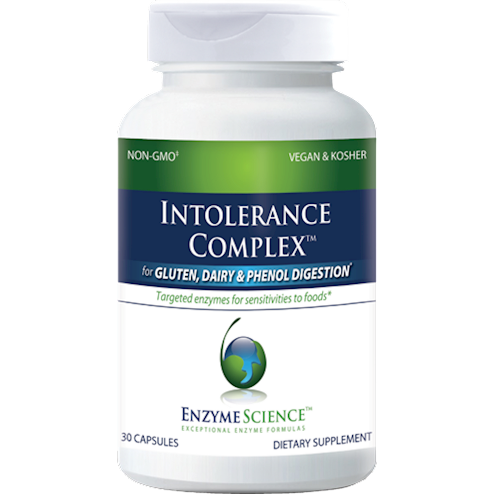 Provides specialized enzymes for the most common food intolerances.* Intolerance Complex offers a broad approach to digestive sensitivities.* This unique formula was crafted to cover all of the major food intolerances in a single capsule.* Unlike food allergies, which are an immune reaction, food intolerance is a digestive occurrence caused by an insufficient quantity of a particular enzyme to digest the offending food. Intolerance can manifest as occasional diarrhea, bloating, cramping or upset stomach. By supplementing the digestive system with targeted enzymes, the body can more efficiently break down foods to lessen or prevent symptoms that are common to food intolerance.* Intolerance Complex gives your body what it needs to enjoy the foods you love. Enzyme Science formulates each enzyme focused product with exclusive Thera-blend enzymes. The Thera-blend process is scientifically designed to provide optimal solutions for digestive health and wellness. These unique protease, amylase, cellulase and lipase enzymes are comprised of multiple variants which are blended to work synergistically throughout the broad pH range of the human body. High-potency digestive enzyme blend Specialized for gluten, casein, lactose, complex carbohydrate and phenol sensitivities* Contains additional enzymes for fat, fiber, protein, and carbohydrate digestion*