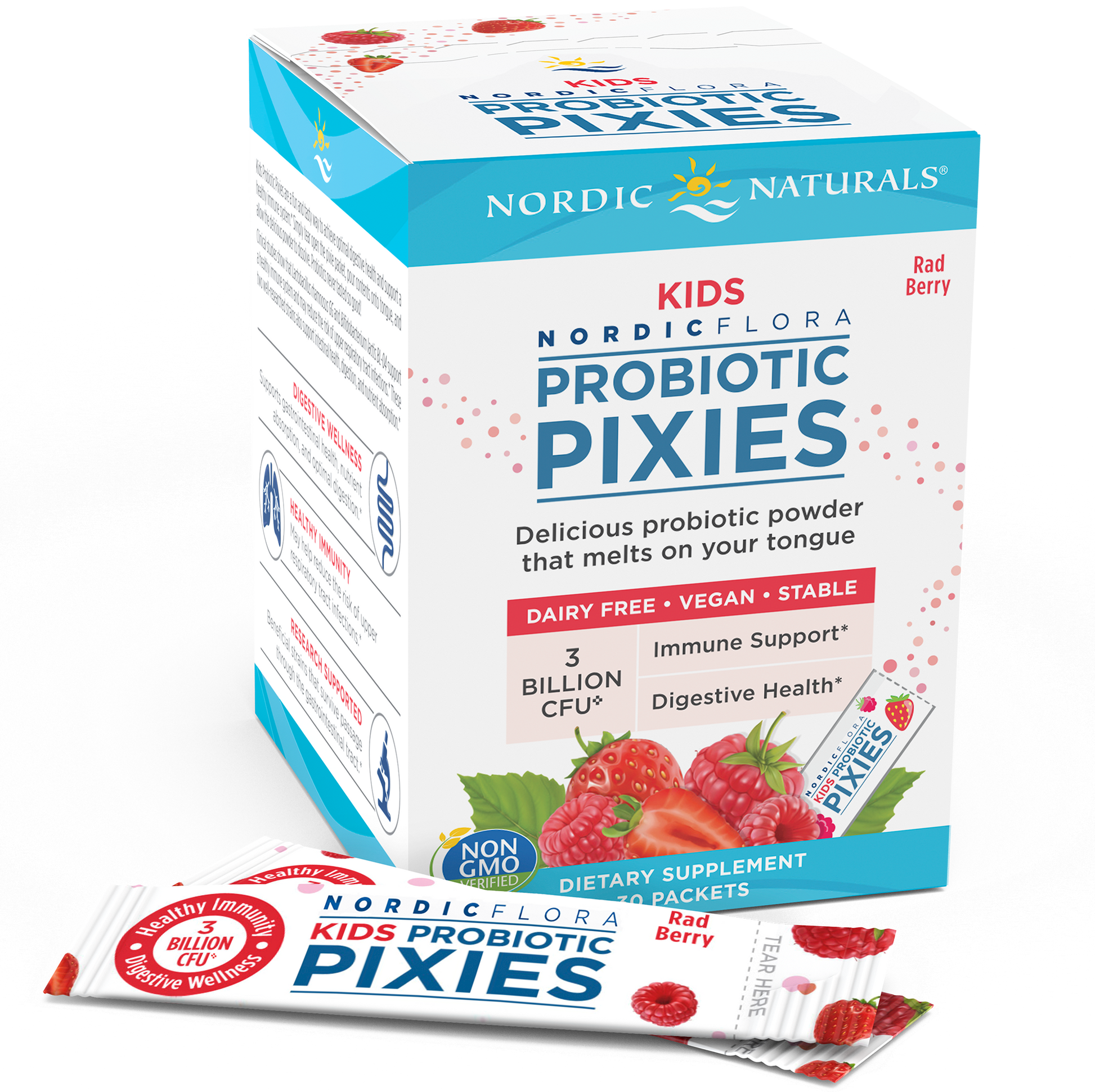 Kids Probiotic Pixies are a fun and tasty way to get the probiotics children need for optimal wellness.* Simply tear open the pixie packet, pour contents onto your tongue, and allow the delicious, berry-flavored powder to dissolve. Probiotics never tasted so good! Clinical studies show that Lactobacillus rhamnosus GG and Bifidobacterium lactis BL-04 support a healthy immune system and may reduce the risk of upper respiratory tract infections.* These two well-researched strains also support intestinal health, digestion, and nutrient absorption.* The single-serving-size pixie packets need no refrigeration, and are perfect on-the-go additions to lunch boxes or bags. Gluten-free, dairy-free, and allergen-free, with no artificial flavors, colors, or preservatives. Like everything Nordic Naturals makes, Kids Nordic Flora Probiotic Pixies is non-GMO and third-party tested for potency and purity. For ages 3+ 3 billion CFU Delicious rad berry flavor Promotes overall digestive and immune health* Helps reduce the risk of upper respiratory tract infections* No artificial colors, flavors, sweeteners, or preservatives