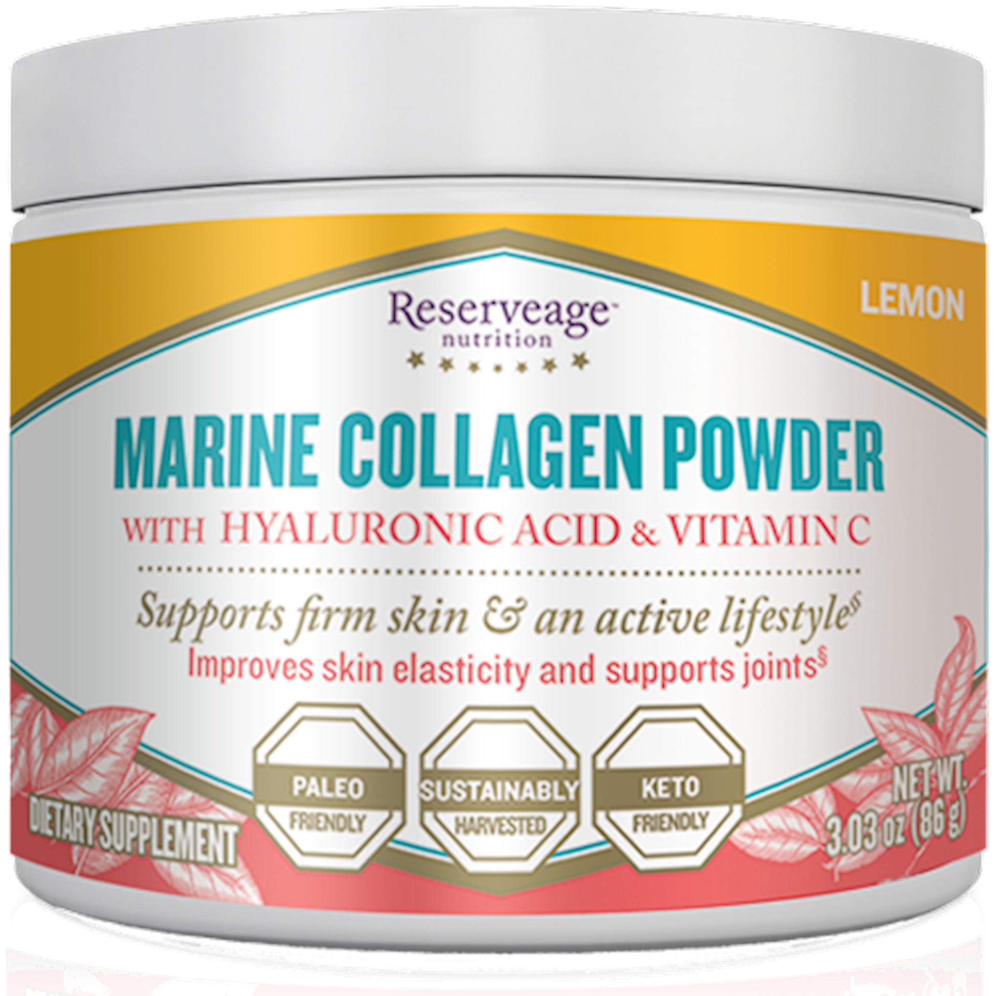 Collagen, a marine-based way for you to remain consistent with your lifestyle. Reserveage Nutrition Marine Collagen Powder uses high-quality, sustainably harvested fish collagen, Naticol Marine Collagen Peptides to support the connective tissue that lends strength and structure to skin, joints and tendons, and promotes strong bones.* This crisp, lemon-flavored fish collagen protein is enhanced with the power of vitamin C, a nutrient needed to activate and support collagen production, and hyaluronic acid to help hydrate skin and joints from within.* Promotes firm, supple skin for a more radiant appearance* Enhances health of joints and connective tissue, and supports bone strength* Sustainably harvested collagen from marine sources