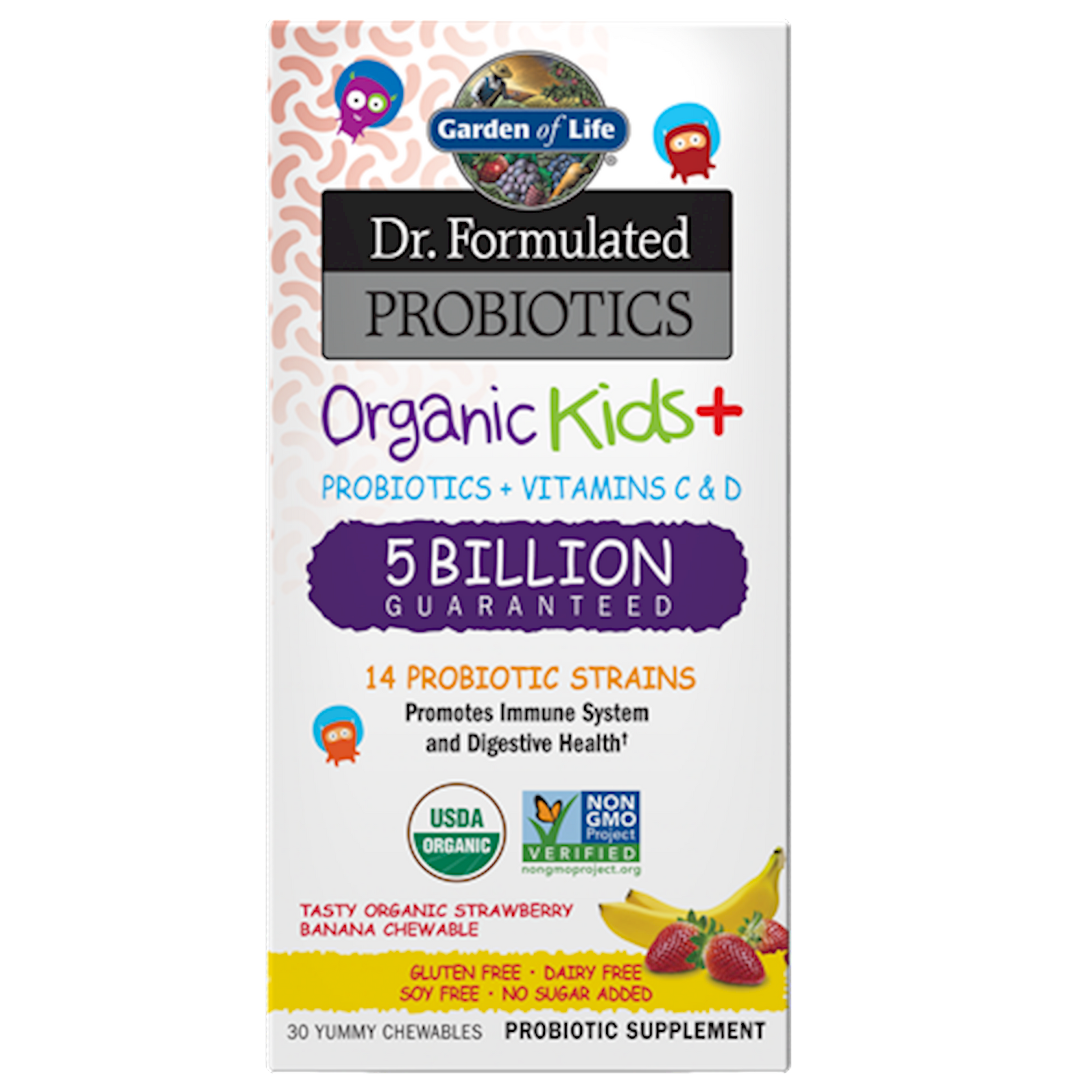 About Dr. Perlmutter: David Perlmutter, M.D., is an expert in the human microbiome, a board-certified neurologist, Fellow of the American College of Nutrition, Americas brain-health expert and #1 New York Times best-selling author. Dr. Formulated Probiotics Organic Kids + is a Certified USDA Organic, Non-GMO Project Verified delicious chewable probiotic, with no added sugars or sweeteners, designed to help build a healthy microbiome and support childrens digestive and immune health.* Dr. Perlmutter created this unique Immune System and Digestive Support formula ,especially for kids. Each chewable is Certified USDA Organic, Non-GMO Project Verified tastes great and has no added sugar.* It also contains vitamin C from Organic Amla (30mg), vitamin D (400IU) and prebiotic fiber to help support a healthy immune system.* Organic matters, too. That means its grown without toxic pesticides, antibiotics, hormones and no genetic engineering. Dr. Formulated Probiotics Organic Kids+ 5 Billion CFU Benefits: Supports immune system and digestive health* 5 billion CFU; 14 probiotic strains Vitamin C from organic Amla (30mg); vitamin D (400IU) and prebiotic fiber Available in Garden of Life's cold-shipped, Arrive Alive packaging or Garden of Life's Shelf StableNo Refrigeration Required packaging No added sugar Yummy chewables with a tasty organic berry cherry flavor kids love Grown without toxic pesticides, antibiotics, hormones and no genetic engineering Organic Kids+a unique Certified USDA, Non-GMO Project Verified Organic yummy chewable probiotic especially for kids to offer immune system and digestive support.*