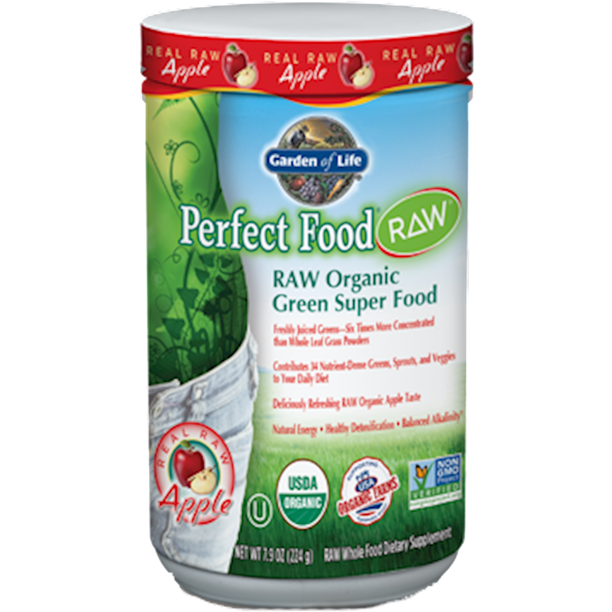 Raw Perfect Food is the only RAW Vegan Green Super Food available in capsules and Certified USDA Organic powder. Both versions are packed with the power of 34 nutrient-dense, RAW, organically grown greens, sprouts and vegetable juices for the RAW energy you need every day.* Perfect Food RAW organic grasses are juiced and cold-temperature dried immediately at the farm within an hour of harvesting, locking in the concentrated nutrition everyone looks for in a greens supplement. Capture the power of the sun with Raw Perfect Food. Packed with the energizing power of 34 nutrient-dense, RAW, organic greens, sprouts and vegetable juices, Raw Perfect Food provides foundational nutrition your body craves to support healthy digestion, detoxification, a healthy immune system, already healthy blood sugar levels in the normal range and metabolism.* Raw Perfect Food is a RAW, organic, whole food nutrition supplement providing naturally occurring chlorophyll, antioxidants, enzymes, amino acids, essential fatty acids and dozens of phytonutrients. Bursting with prebiotics, probiotics and enzymes to support healthy digestion and nutrient absorption,* Raw Perfect Food is the convenient, delicious way to get your veggie juice every day. Raw Perfect Food Organic Apple puts the GREEN in greens* with young cereal grass juices such as barley, alfalfa, oat, wheat and kamutsome of the most nutrient-dense foods on the planet. Garden of life Certified Organic greens are sustainably grown by their family famers in the USA. They harvest before the grain buds (to prevent gluten from forming) and then juice at the farm immediately after harvest. Garden of life's juice is gently low temperature dried and powdered onsite locking in its nutritionally dense, organic goodness. The end result is highly bioavailable and many times more concentrated in nutrients, including chlorophyll, than whole leaf grass powders. Raw Perfect Food Green Superfood Benefits: RAW energy.* Supports healthy digestion.* Supports healthy metabolism.* Helps support alkalizing and detoxifying.* Supports healthy immune function.* Helps support healthy blood sugar levels already in the normal range.* Raw Perfect Food - Raw organic green super food from freshly juiced greens in convenient capsules.