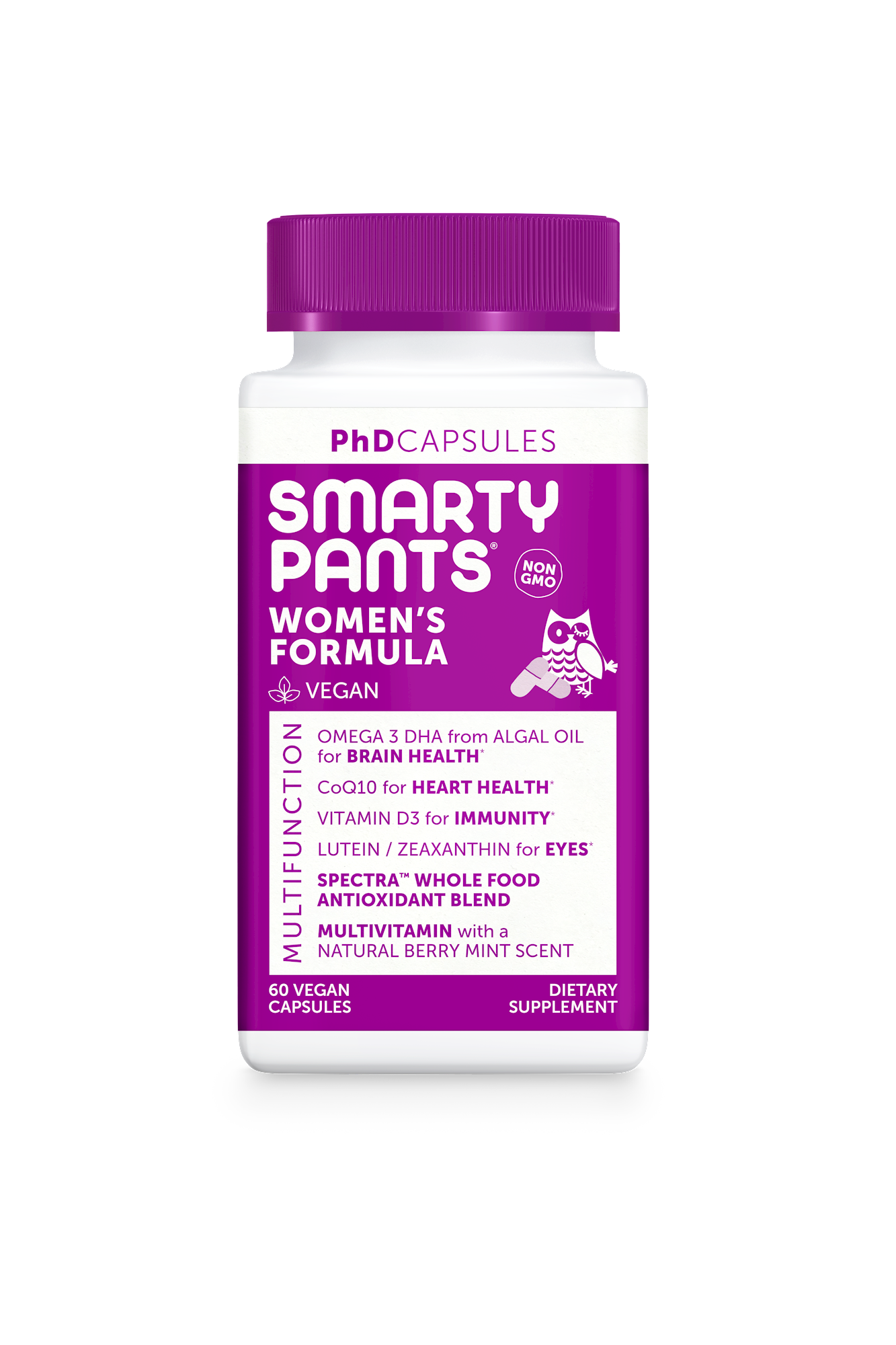 Serving Size: 2 Capsule Servings Per Container: 30 Disclaimer Amount Per Serving Vitamin A (as 50% beta-carotene USP, retinyl palmitate USP) 270 mcg 30% Vitamin A (as 50% beta-carotene USP, retinyl palmitate USP) Vitamin C (as ascorbic acid) 54 mg 60% Vitamin D (D-3 as cholecalciferol from Lichen) (2000 IU) 50 mcg 250% Vitamin E (as d-alpha-tocopherol from sunflower oil) 12 mg 80% Vitamin K (K-1 as phylloquinone) 24 mcg 20% Thiamin (Vitamin B-1 as thiamine mononitrate) 0.6 mg 50% Riboflavin (Vitamin B-2) 0.26 mg 20% Niacin (Vitamin B-3 as inositol niacinate) 4 mg 25% Vitamin B-6 (as pyridoxal 5-phosphate) 1.5 mg 88% Folate (as L-methylfolate, glucosamine salt) DFE 400 mcg 100% Vitamin B-12 (as methylcobalamin) 4.8 mcg 200% Biotin 45 mcg 150% Pantothenic acid (as calcium D-pantothenate) 5 mg 100% Choline (as choline bitartrate USP) 55 mg 10% Iron (as sunactive ferric pyrophosphate 3.6 mg 20% Iodine (as potassium iodide USP) 150 mcg 100% Magnesium (as magnesium citrate USP) 8.4 mg 2% Zinc (as zinc citrate) 4 mg 36% Selenium (as L-selenomethionine) 14 mcg 25% Copper (as copper chelate) 0.27 mg 30% Algal oil 75 mg Omega-3 DHA (docosahexaenoic acid) 50 mg Vitamin K-2 (as menaquione-7) 18 mcg Coenzyme Q10 (as ubiquinone USP) 60 mg Inositol (as inositol niacinate) 1 mg Lutemax 2020 marigold flower extract 40 mg Lutein 10 mg Zeaxanthin 2 mg Smartypants probiotic blend: 3 billion CFU 30 mg Bacillus coagulans MTCC5856 lactospore 2 bilion CFU 20 mg Bacillus subtilis DE111 1 billion CFU 10 mg Spectra whole food antioxidant blend: 100 mg Coffea arabica Extract Green Tea Extract Broccoli Sprout Onion Extract Apple Extract Quercetin Acerola Extract Tomato Broccoli Acai Basil Cinnamon Garlic Oregano Turmeric Carrot Elderberry Mangosteen Camu Camu Blackberry Blackcurrant Extract Blueberry Extract Raspberry Spinach Chokeberry Kale Sweet Cherry Brussels Sprout Other ingredients: Sunflower Lecithin, Maltodextrin, Modified food starch, Hydroxypropylmethylcellulose (Vegan Capsule), Rice Flour, Rice starch, Pectin, Natural flavor, Glycerol, Coconut Oil Powder, Mixed tocopherols, Silicon dioxide
