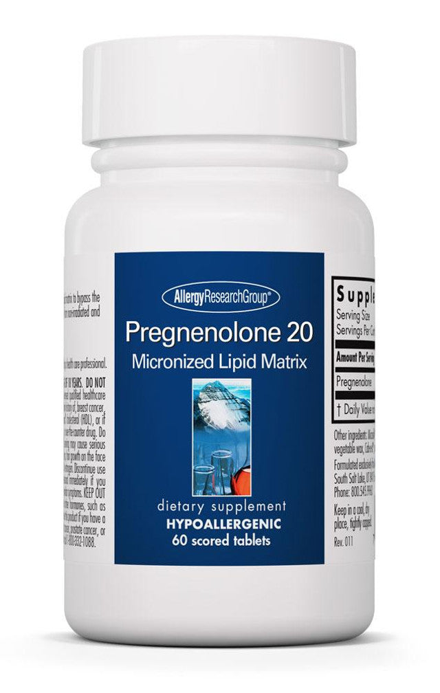 Pregnenolone 20 mg is micronized, plant-sourced pregnenolone formulated in a lipid matrix to bypass the liver, with a particle size of less than 50 microns. Soy free – the source material (wild yam) is non-irradiated and non-ethylene-oxide-treated.