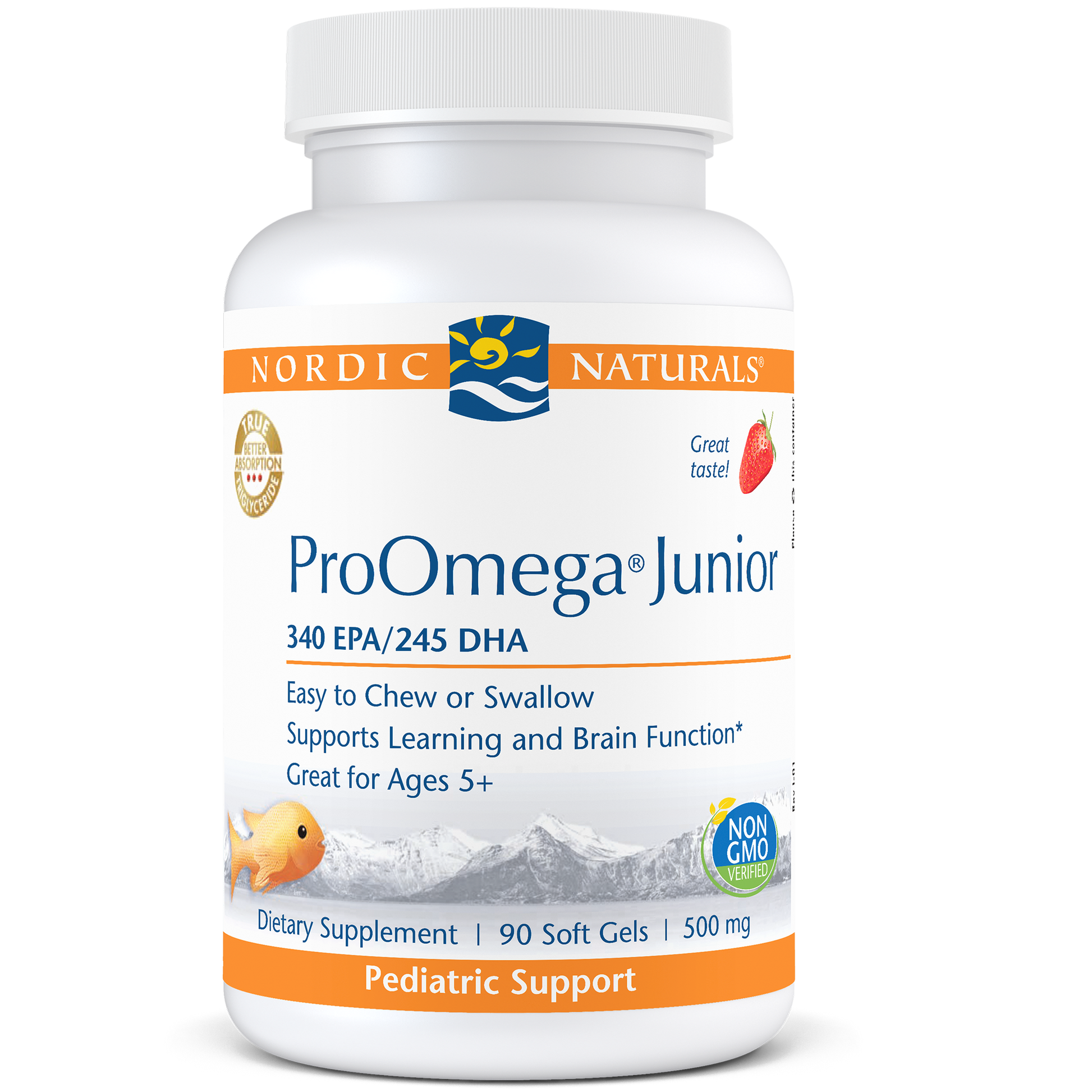 For people wanting the double-strength formula in a smaller soft gel, ProOmega Junior offers high-intensity omega-3 support for the heart and brain.* Ideal for children, older adults, and people of all ages, the strawberry-flavored, 500 mg soft gels are easily swallowed or chewed. Great double-strength formula Smaller 500 mg soft gels are easy to swallow or chew Ideal for children, older adults, and people of all ages High-intensity support for the heart and brain* Great-tasting, all-natural strawberry flavor