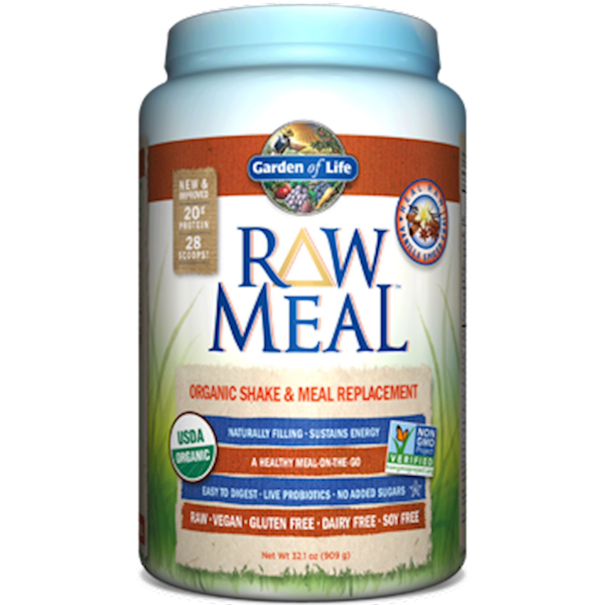 Raw Organic Meal is a delicious organic MEAL-ON-THE-GO packed with incredible nutrition to help you satisfy hunger, manage weight and feel great! Raw Organic Meal uniquely combines the goodness of multiple Garden of Life products in one complete raw organic meal replacement. Basically, it has the nutrition of seven products in one container! Raw Organic Meal delivers 20 grams of clean protein per scoop from 13 raw sprouted ingredients, along with greens, healthy fat, 7g of Organic Fiber, probiotics, enzymes, plus 21 vitamins and minerals. You have a busy, on-the-go life and lifestyle, but you still want to eat healthy, so fast food is just not an option for you. Thats why theres Raw Organic Meal - convenient, organic shake and meal replacement thats packed with 44 superfoods that not only satisfies your hunger, but also is naturally filling while boosting energy, and provides you with the protein, fiber, vitamins and minerals you would find in a healthy shake or meal of raw foods. A one-scoop serving delivers 20 grams of clean Certified USDA Organic and Non-GMO Project Verified protein, while two scoops pack a whopping 40 grams of clean organic proteinall from 13 organic sprouted grains and seeds. RAW Organic Meal also includes fruits and vegetables, greens juices, has live probiotics and enzymes as well as 21 whole food vitamins and minerals. Just as important is whats not in RAW Organic Meal. It has no gluten, soy, dairy, tree nuts, filler ingredients, artificial colors, flavors, sweeteners or preservatives. And its RAWsince heat and processing can denature proteins. Raw Organic Meal Shake & Meal Replacement Benefits: Convenient organic, Raw shake and meal replacement Helps support energy and muscles Helps you stay full and can help support a healthy weight 1.5 Billion live probiotics plus enzymes to support digestive health Raw Organic Meala yummy tasting organic meal-on-the-go packed with incredible nutrition to help you satisfy hunger, manage weight and feel great!*