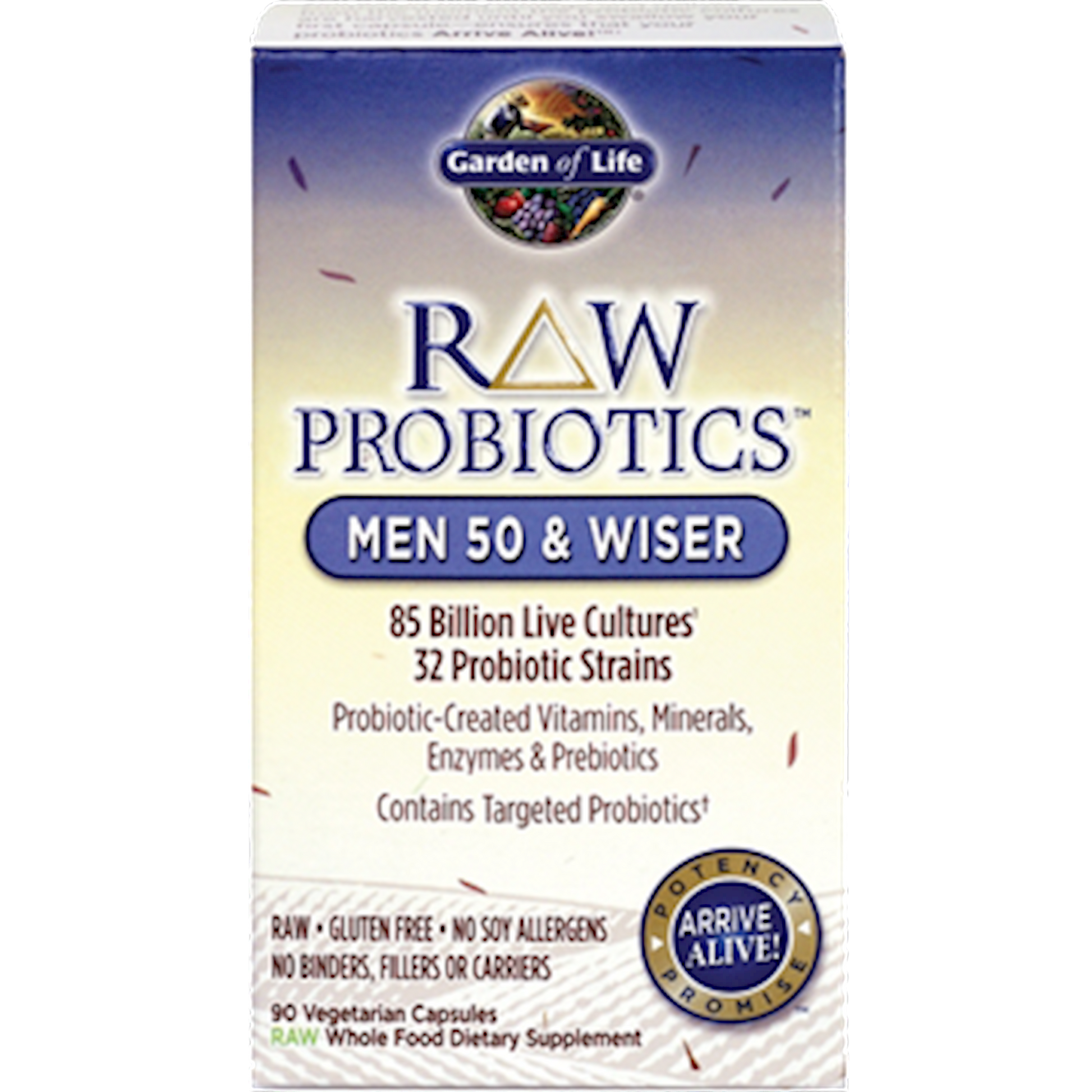 RAW Probiotics is a unique line of high-potency, RAW, whole food probiotics that are age- and gender-specific. Unlike isolated strains of probiotics, RAW Probiotics offers all the benefits of a true food probiotic with a record-setting 30+ probiotic strains. So, its not just isolated bacteria in a pill; RAW Probiotics is a whole-food probiotic that emulates eating fermented food. Made with mainly Bulgarian yogurt concentrate, Wild European kefir grains and scobies, and concentrated clinically studied probiotics strains, RAW Probiotics is created below 40 F and 30% humidity so that what you see on the label is what you get in the bottle. Garden of Life RAW Probiotics Men 50 & Wiser is a RAW, full spectrum, whole food probiotic formula specifically designed to meet the unique needs of men over 50. RAW Probiotics Men 50 & Wiser offers 32 original probiotics, including L. fermentum and B. animalis sub. Lactis, specifically formulated for men over 50 to support immune function and support healthy cholesterol levels already in the normal range.* RAW Probiotics Men 50 & Wiser also delivers probiotic-created vitamins, minerals and prebiotics as well as dairy-digesting enzymes to help support the break down of lactose and casein.* RAW Probiotics Men 50 & Wiser goes Beyond Probiotics offering a broad range of benefits specifically targeted for men over 50. RAW means Garden of Life's probiotics are uncooked, untreated, unadulterated, with no binders or fillers and no carriers such as maltodextrin or dextrose. What you see on the label is what you get in the bottletemperature-controlled cold storage and delivery from the moment the probiotic cultures are harvested until you swallow your first capsuleensures that your probiotics Arrive Alive! At Expiration Date under recommended storage conditions. Best if refrigerated. Store in a dry place at 71F (22C) or below. Raw Probiotics Men 50 & Wiser Benefits: Supports colon health, bowel regularity and overall digestive function* Supports gut-related immune system function and overall immune system health* Supports healthy microbial balance by promoting healthy bacteria in the gut* Supports healthy nutrient absorption and assimilation* Helps support healthy blood sugar levels that are already in the normal range* Arrive Alive! Potency Promise No Binders, Fillers or Carriers RAW Probiotics Men 50 & Wisera whole food probiotic with more strains and a higher CFU count than most that is RAW, delivered cold and offers an incredible value.