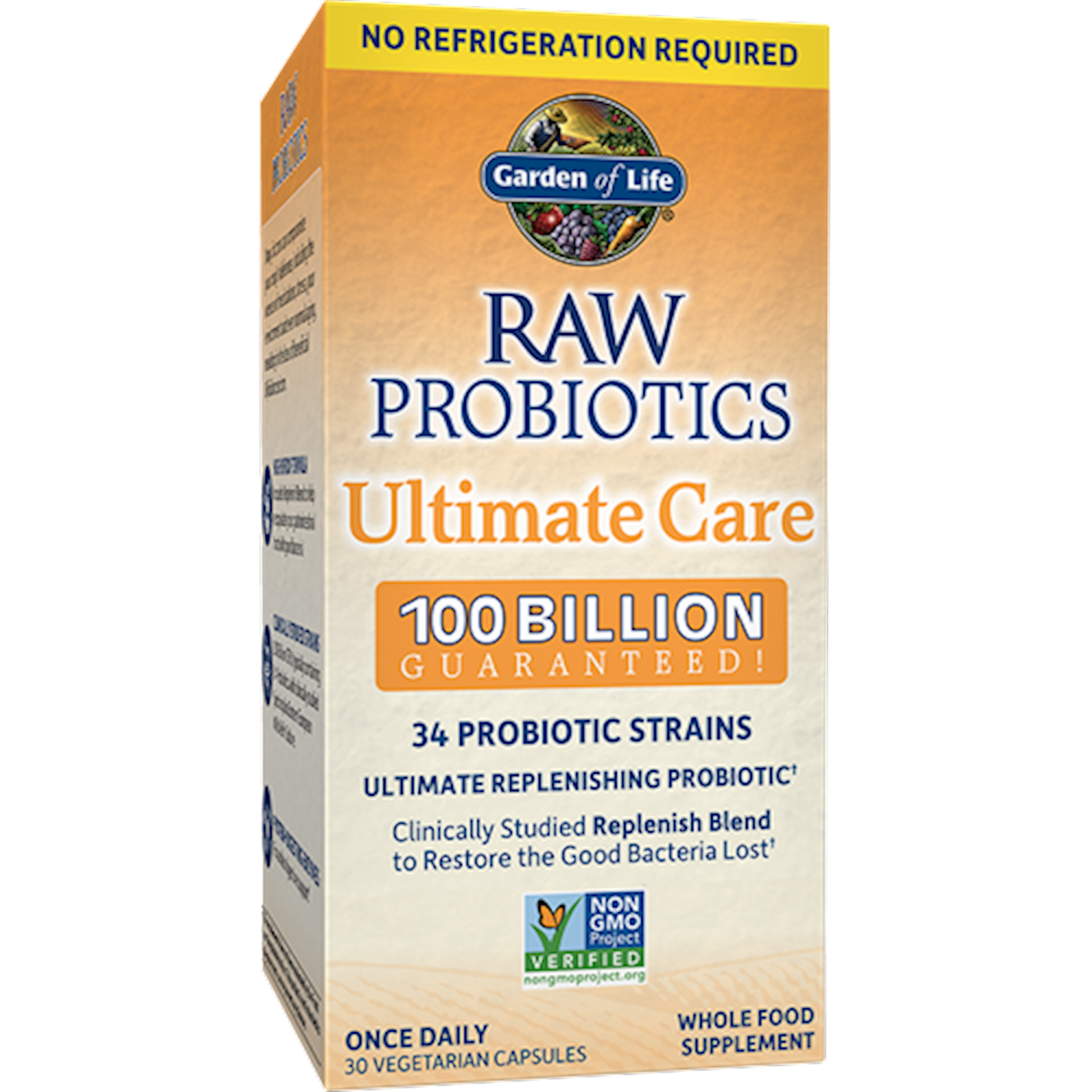 RAW Probiotics is a unique line of high-potency, RAW, whole food probiotics that are age- and gender-specific. Unlike isolated strains of probiotics, RAW Probiotics offers all the benefits of a true food probiotic with a record-setting 30+ probiotic strains. So, its not just isolated bacteria in a pill; RAW Probiotics is a whole-food probiotic that emulates eating fermented food. Made with mainly Bulgarian yogurt concentrate, Wild European kefir grains, and scobies, and concentrated clinically studied probiotics strains, RAW Probiotics is created below 40 F and 30% humidity so that what you see on the label is what you get in the bottle. Garden of Life RAW Probiotics Ultimate Carethe ultimate complementary probiotic. Many factors can compromise your bodys defenses, including the overuse of medications, stress, your environment, and even normal aging, resulting in the loss of beneficial Bifidobacterium. RAW Probiotics Ultimate Cares high Bifido formula includes the clinically studied Replenish Blend, making it your ultimate complementary probiotic to achieve balancehelping you repopulate your gastrointestinal tract with good bacteria.* RAW means Garden of Life's probiotics are uncooked, untreated, unadulterated, with no binders or fillers and no carriers. What Garden of Life promise on the label is what you get100 billion live probiotic cultures in a convenient once-daily capsule. Garden of Life's shelf Stable, patent-pending desiccant-lined bottle technology ensures your probiotics Arrive Alive! Raw Probiotics Ultimate Care Benefits: A once-daily servingin one small, easy-to-swallow capsule Has 34 RAW probiotic strains supporting flora diversity as found in nature* Features the clinically studied Replenish Blend to help restore the good bacteria lost* Provides protein-digesting enzymes for added digestive support* Arrive Alive! Potency Promise No Binders, Fillers or Carriers RAW, Non-GMO, Gluten-Free and Soy Free RAW Probiotics Ultimate Carea high-potency, RAW, whole food ultimate complementary probiotic to empower your extraordinary health.