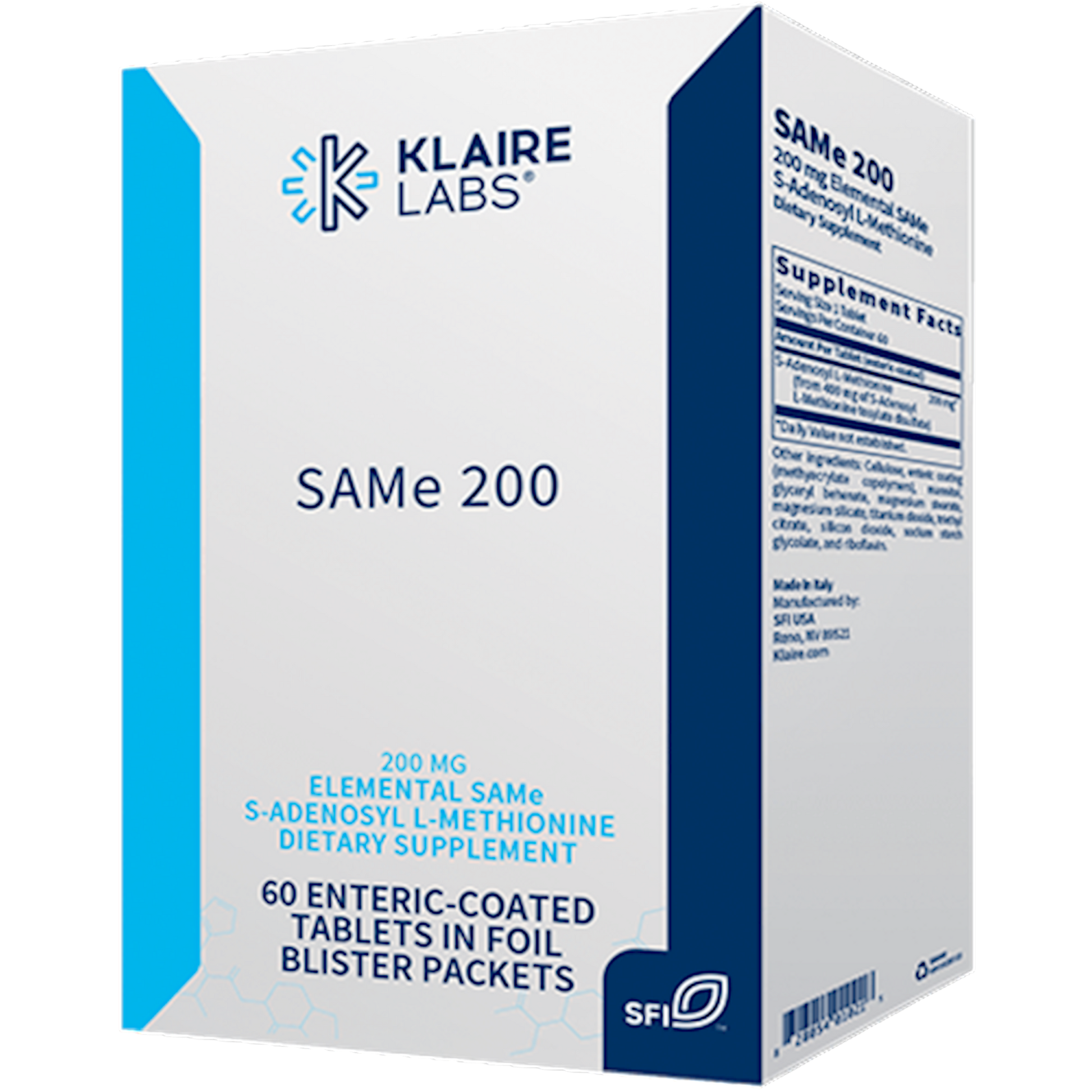 Versatile nutrient supports mood regulation, joints, and liver function.* An impressive amount of research and long history of clinical use documents the benefits of SAMe. As a modulator of cell membrane fluidity and neurochemical activity in the central nervous system, it helps support mood and optimal brain function.* The sulfur in SAMe is used to help build cartilage and strong joints and for synthesis of taurine and glutathione, used in liver detoxification processes.* SAMe also helps synthesize polyamines required for normal cell growth.* The reactive nature of SAMe prevents it from being used in combination nutrient products, but it can be stabilized as a single ingredient with careful manufacturing and an enteric tablet coating. This product provides a pharmaceutical grade, stabilized SAMe manufactured under low temperature and low humidity conditions. An enteric tablet coating is applied to further ensure a biologically active product. Each tablet contains a full 200 mg of elemental SAMe from 400 mg SAMe tosylate disulfate.